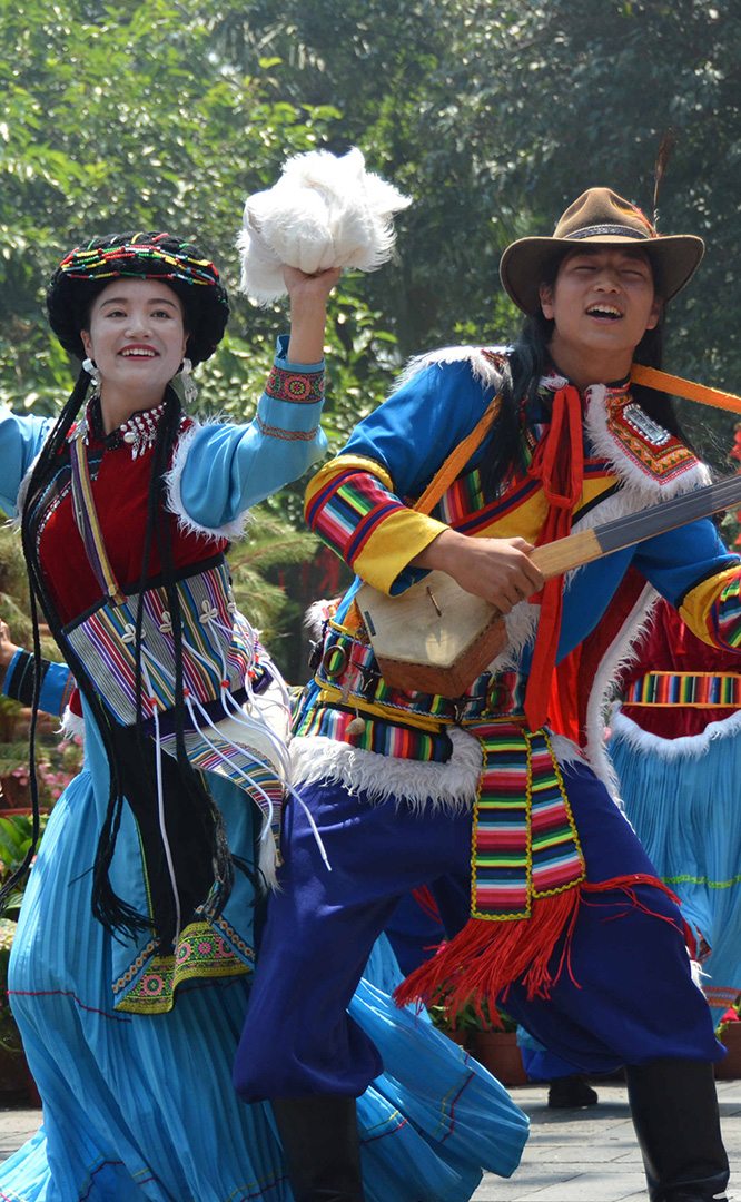 彝族在云南境內約471萬人,是省內人口最多、分布最廣的少數民族,主要聚居在金沙江、元江流域和哀牢山、無量山腹地。彝族是一個能歌善舞的民族,民間打歌、跳樂之風盛行,大三弦、跌腳舞久負盛名。火把節是彝族最具特色的民族節日。彝族村占地50余畝,三虎浮雕墻與虎頭內祖師形象表現了彝族虎鷹文化。太陽歷廣場圖騰柱上有太陽、虎、火和八卦圖形象,周圍環繞著10個朝向不同的月球造型,外圓周有12生肖石雕。依山而建的“...